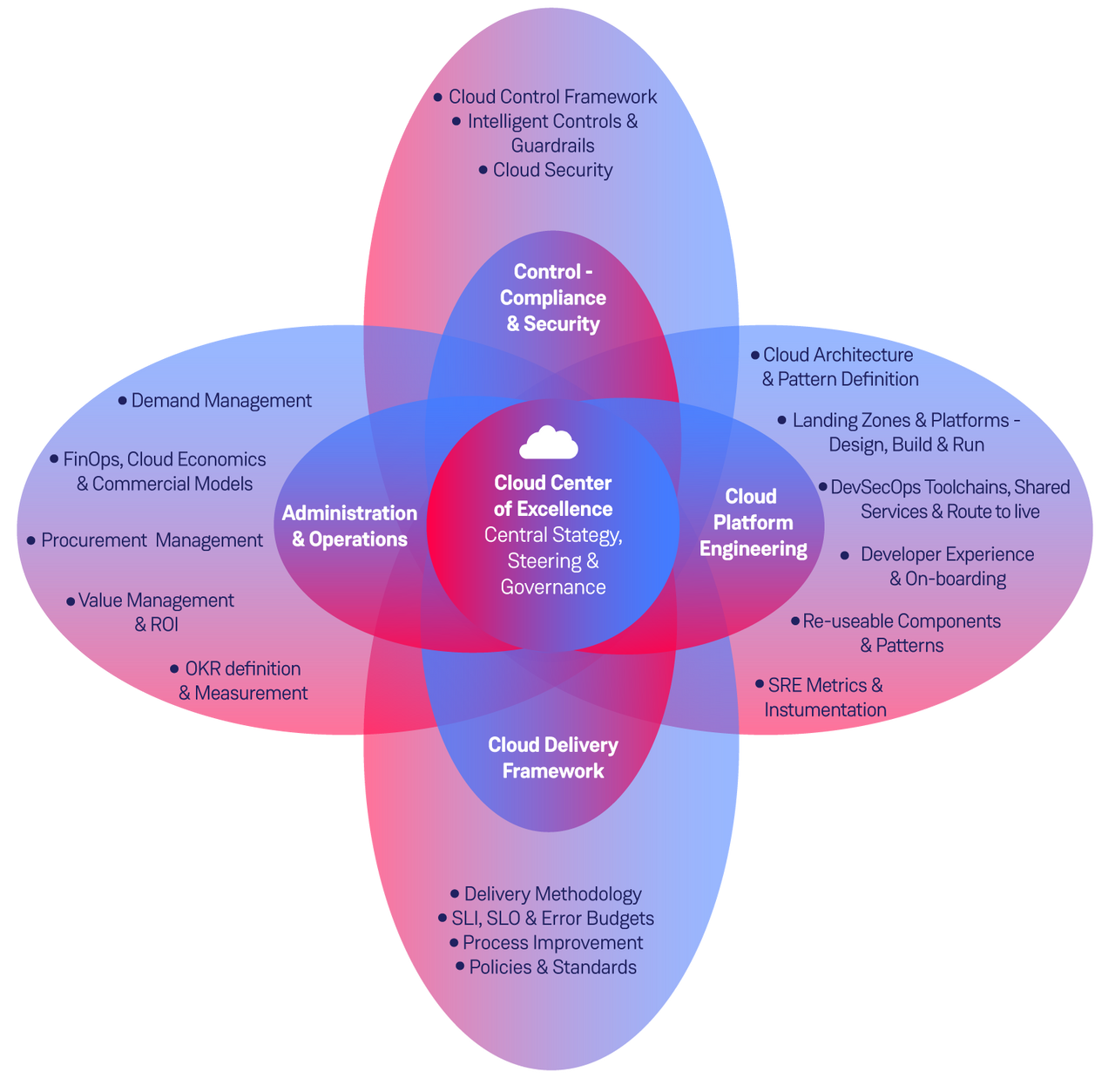 A Cloud Centre of Excellence is a multidisciplinary function, bringing together expertise from a range of disciplines across the business, to champion the cloud and drive forward a secure and compliant path for cloud consumption. It is effectively a miniature, internal representation of how the organisation as a whole should work with regards to cloud.