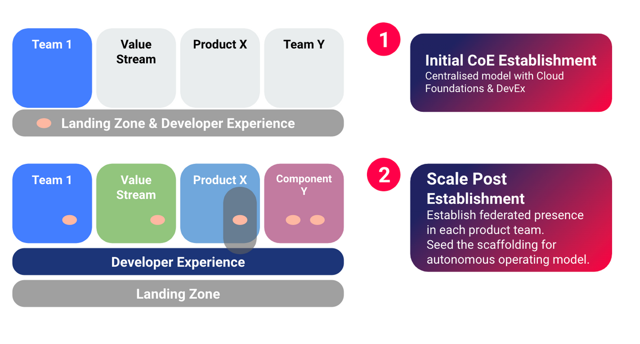 However, the Cloud CoE has to go a step further and deliver an organisational blueprint across people, process and technology in order for cloud adoption to be successful in the medium to long term. If not, the CCoE runs the risk of clashing with organisational values and structures that stood it up in the first place.