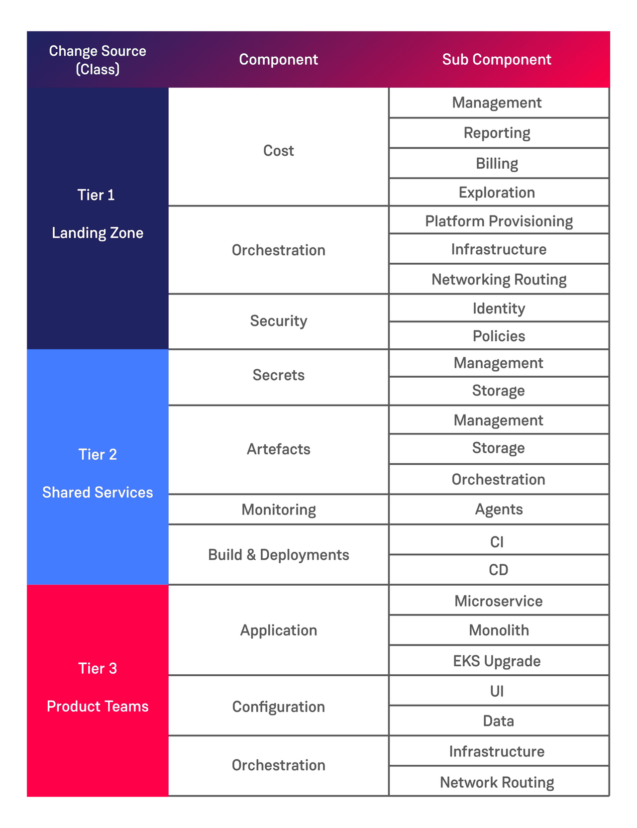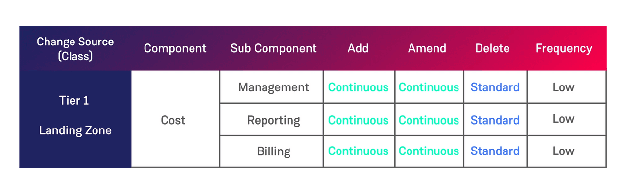 Getting our clients to think through making changes such as ‘Add’, ‘Remove’ and ‘Update’ to each component can help facilitate conversations around these components and ultimately creates the change contract between the development teams and the operational teams. In addition to this beginning to think about the frequency of change can also help guide which change types are applicable to which component.