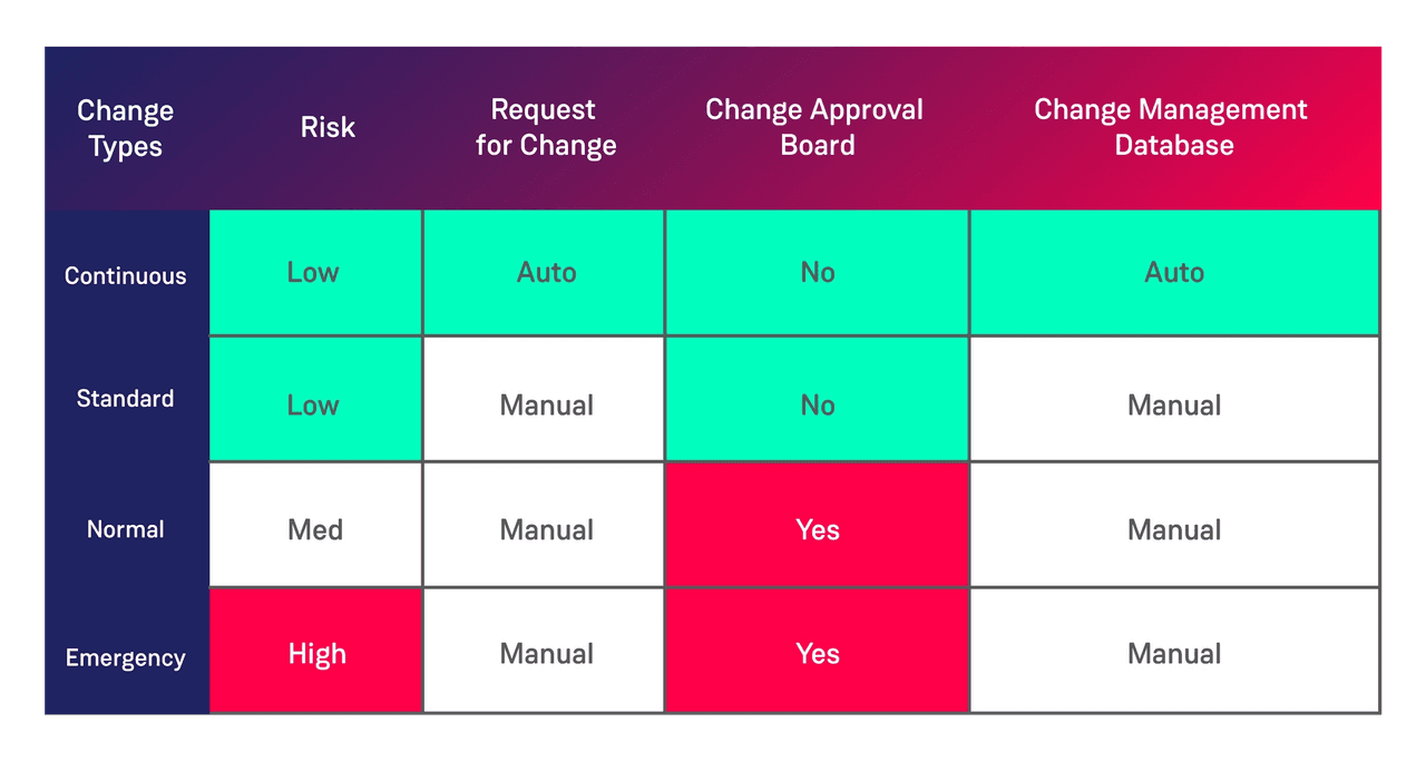 We suggest adding an additional change type “Continuous Change” to allow for change to be made with a request for change (RFC) created automatically in the system of record (e.g. ServiceNow) which does not require review or approval.