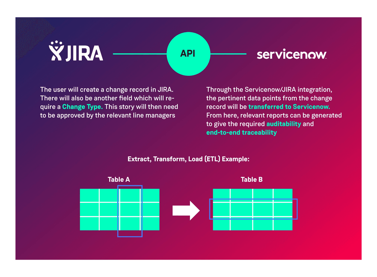 One common integration we often encounter is that which allows us to link WHY things have been changed with the rest of the change record. In this instance we suggest integrating between the likes of Jira/Rally and ServiceNow using the available APIs.