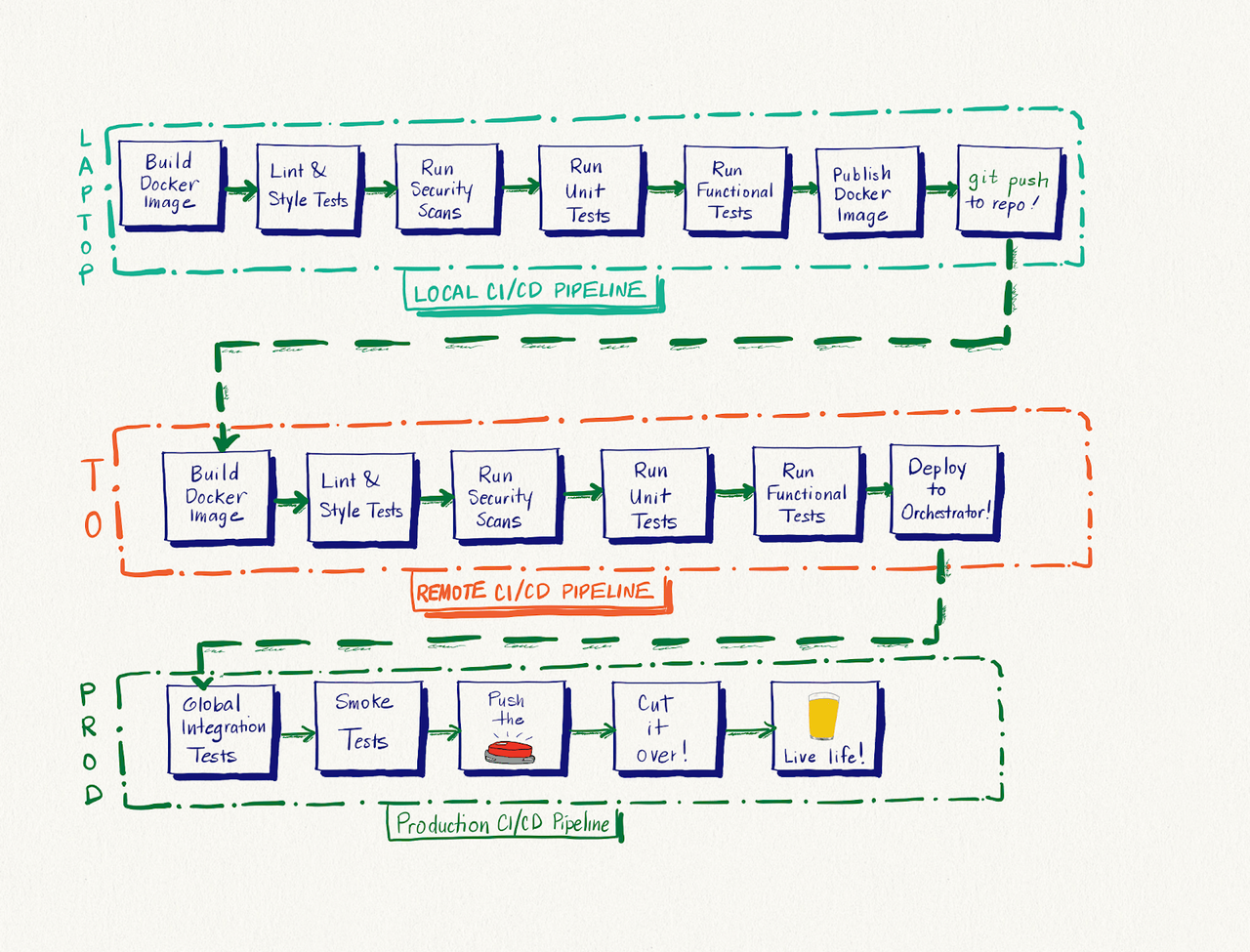 Ideally, with container-driven development, whenever a developer writes a bugfix or new feature code, assuming that they have their pipelines written in code, she should be able to use it to run unit, security and style tests, package the new version of their app into a container image after they pass, create a Docker container from that image, run integration tests against that container and, most importantly, know with nearly complete confidence, that any containers created from that image will work in production, all from their laptop or workstation. The workflow below illustrates this process: