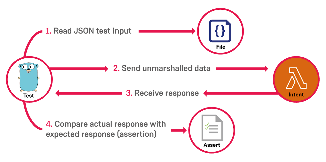 Running the manual test in the Developer Portal will show the request and response in JSON format. For our testing approach, we will use the request as our test input and we will store the request from the above “JSON Input” text area as a JSON file in our testdata directory. Then we implement a test method using the Golang built-in Test framework that reads the test data, unmarshals it and sends it to the actual Intent. The Intent replies with a response that we compare with the expected result as illustrated below: