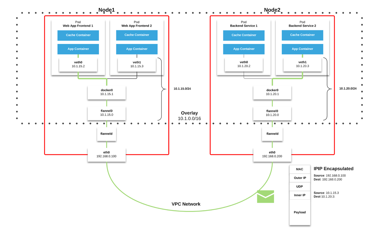In the following example, we can see how overlay networks are implemented through the use of a popular CNI called Flannel. Assume the Pod Web App Frontend 1 which is located in Node1 wants to talk to the pod Backend Service 2 which is located in Node2.