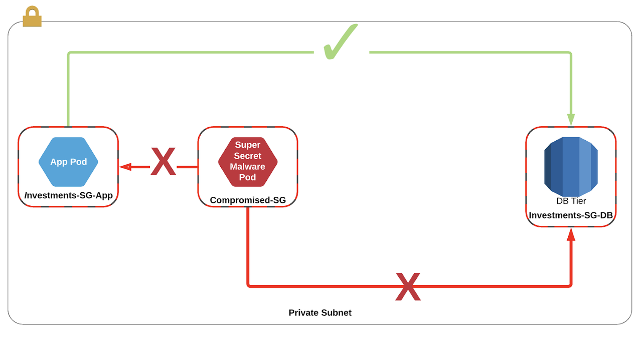 In this example, we can see an extremely simple investments application that is split into three layers: a load balancing tier fronted by AWS ALB, an app tier running on EC2 and a database tier RDS. Each of these layers has its own security group that explicitly allows traffic flows between each tier and implicitly denies all other traffic.