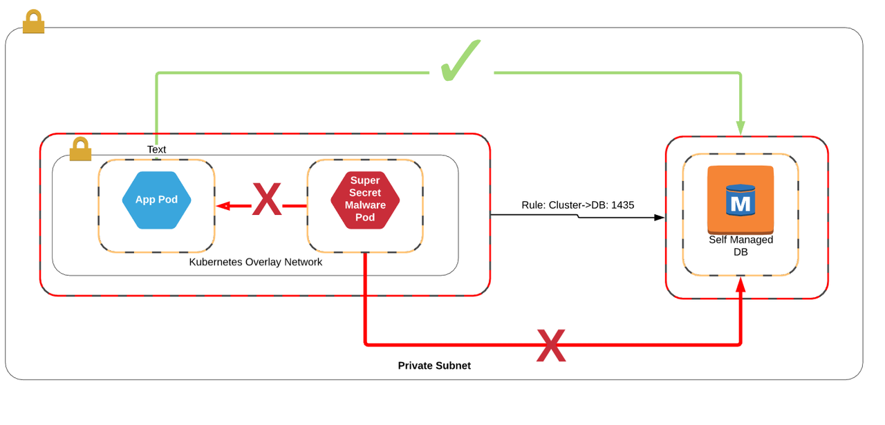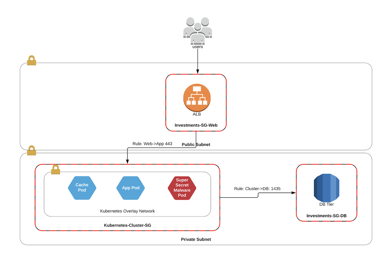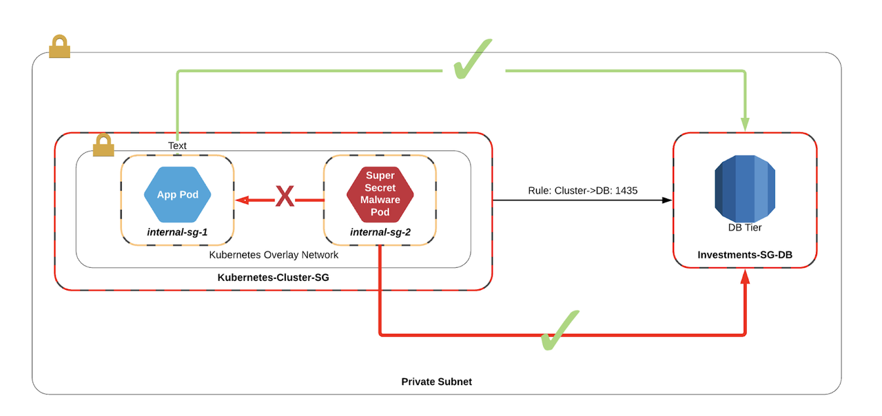 In the old world of Calico/Weave/Flannel, the VPC had no context for the pods, and could only apply security groups to the hosts running the containers. In effect, this meant that any Pod could route to any service that has been exposed to the cluster. If one of those pods gets compromised, it could potentially escalate to a database of which it has access.