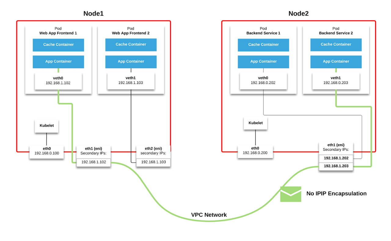 To achieve this outcome, AWS abuses its ability to attach multiple Elastic Network Interfaces (ENIs or vNICs) to a virtual machine, and associate multiple secondary IP addresses with each ENI. Each pod is then able to pick a free secondary IP address, assign it to the pod and allow it to communicate inbound/outbound over that interface.