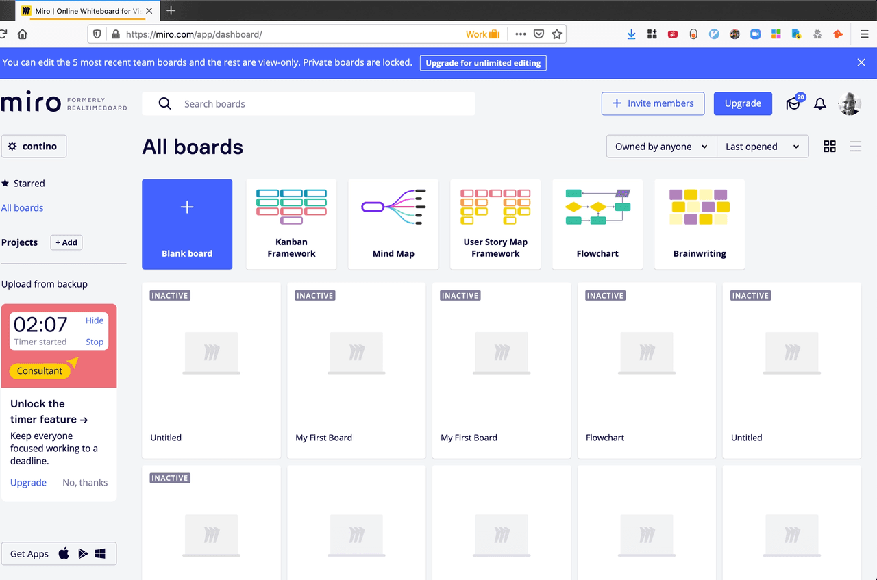 On the surface, Miro is pretty simple. Once you create an account (or connect it with your Google, Slack, Facebook or Office365 account), you click on “Blank Board” to create a new board, like shown below: